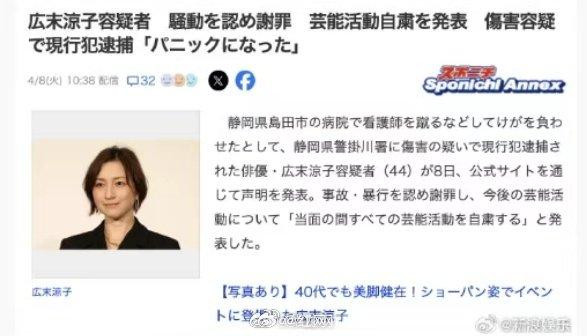 [日本女星广末凉子被警方逮捕本人道歉]]据日本共同社报道,日本静冈县警方表示,一女子在该县岛田市的一家医院殴打一护士并致其受伤,被警方逮捕。该女子已被确认为日本女演员广末凉子。广末凉子所属事务所官网发布声明,确认了广末凉子被捕这一事实。声明称,“4月8日在静冈县内发生了由本人驾驶的汽车引起的交通事故,在被送往医院的医院中一时陷入恐慌状态,结果导致医疗相关人员受伤。给受害的各位以及相关人员带来了很大的麻烦,我从心底表示歉意。目前该案件正在调查中,暂不公布详细情况,但目前将停止一切演艺活动。”
